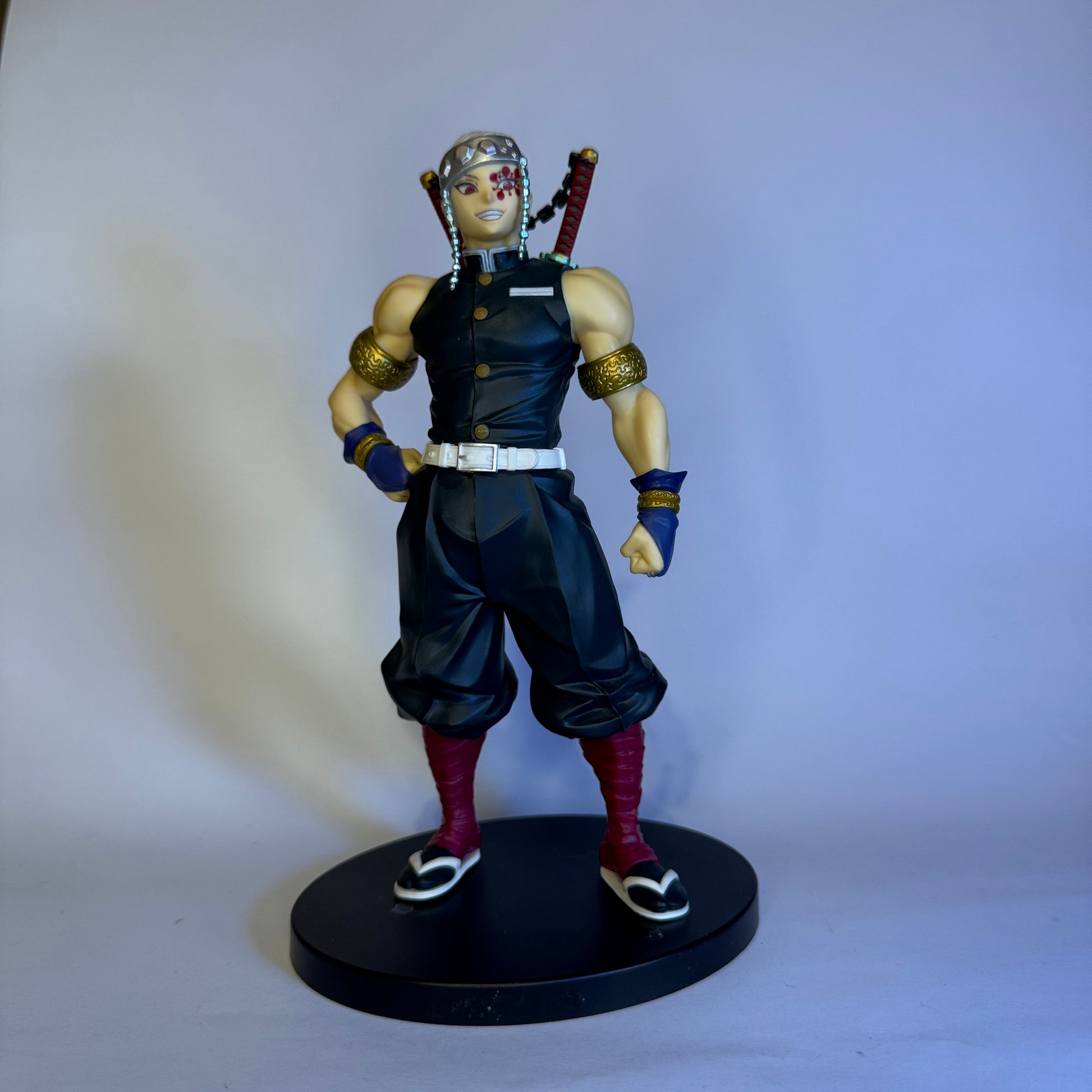 Personagem: Tengen Uzui – Demon Slayer Fabricante: Bandai Altura: 19 cm (aproximadamente) Material: PVC premium de alta resistência Acabamento: pintura detalhada com elementos metálicos e cores vibrantes Pose: imponente, com espadas cruzadas nas costas e expressão confiante Base: preta circular inclusa para exibição estável Embalagem: produto novo, sem caixa e pronto para envio